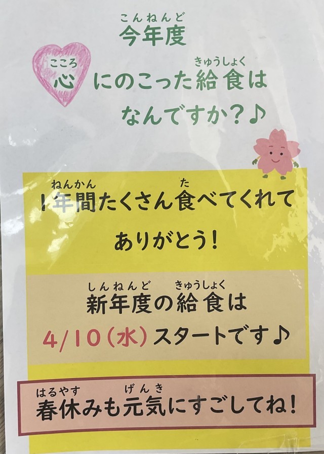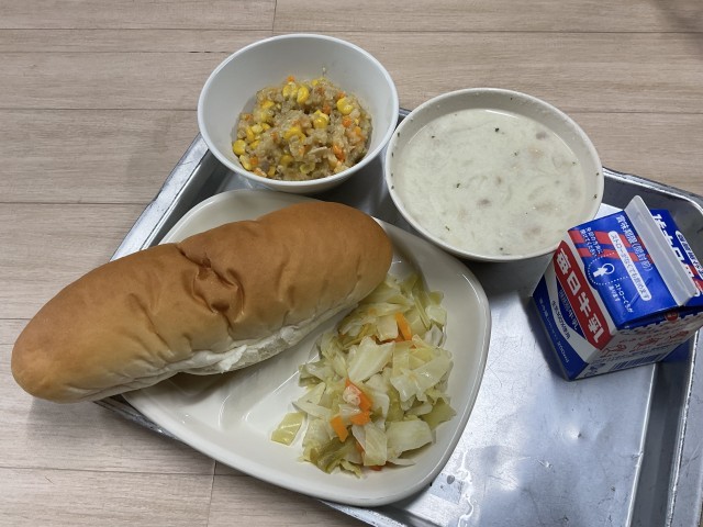 今日は1年で最後の給食です。子ども達も今のクラスで食べる最後の給食ということで、感謝の気持ちを込めて美味しそうに食べていました。来年度の給食を楽しみにしています。【献立】いんげん豆のクリームスープ、ライスソテー、ラハノサラタ、コッペパン、牛乳