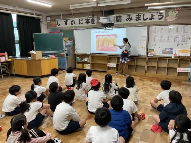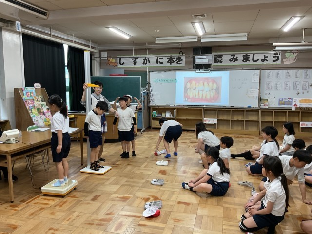 低学年は「保健室の使い方」の話、中高学年は「歯磨きの大切さ」についての話を聞いてから身長体重を測りました。