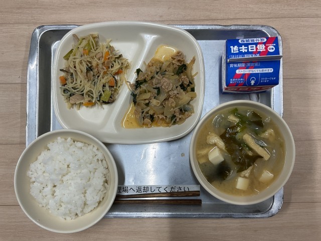初日の給食は「豚スタミナ丼」「ビーフンの炒め物」「みそ汁」。