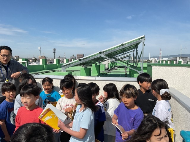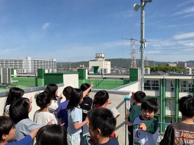 非常階段の1番上まで上がり、学校の周りを観察しています。