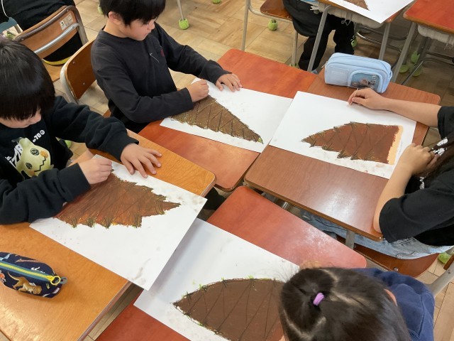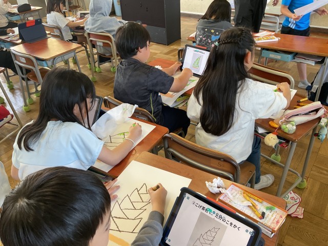 たけのこをクレパスで描いています。上手に描けるようタブレットで描きかたを確認しています。