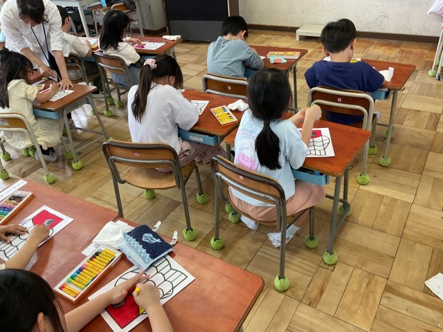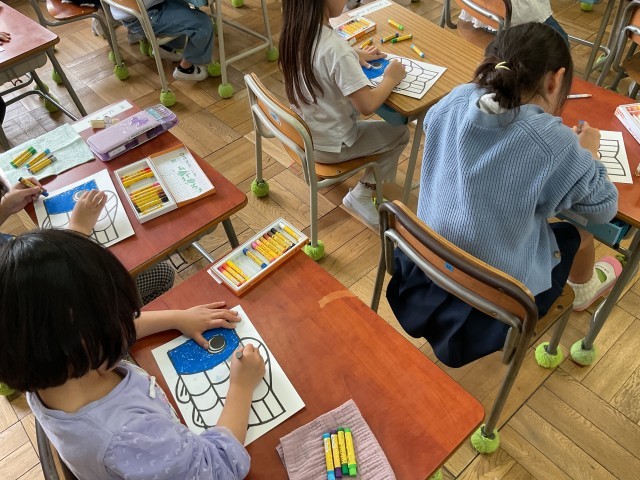 こいのぼりに色をつけています。赤いこいのぼりと青いこいのぼりができています。