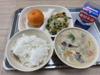 アップルパン、じゃがいももちのキムチスープ、イカと冬野菜の中華いため、もやしの炒め物です。
