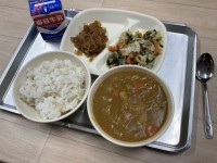 今日の給食の献立は、ご飯、チンゲンサイの炒め物、牛ごぼう、だんご汁です。