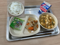 今日の給食の献立は、ごはん、キャベツの昆布あえ、きびなごのかりんあげ、呉汁です。
