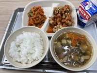 今日から1年生の給食が始まりました。その為か、献立は子どもが好きそうなハンバーグやとうもろこしスープでした。いつもより長い時間、学校で学習をしましたので、皆しっかり給食を味わっていました。【献立】チキンハンバーグ、とうもろこしスープ、フルーツポンチ、コッペパン、牛乳