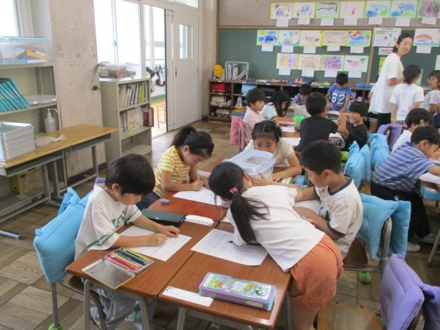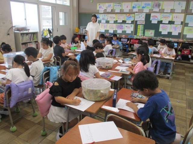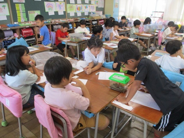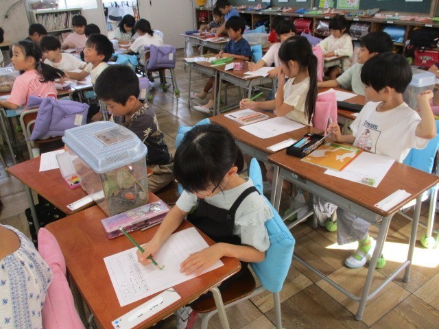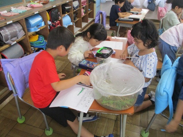 1年生は生活科で「生きもの大好き」の単元を学習しています。学校や家で生きものを探し、「もっと生きものとなかよくなろう」と、バッタやコオロギなどのお世話に取り組んでいます。授業では、生きものを観察して記録する活動を行っています。子どもたちは、興味津々で捕まえてきた生きものを観察し、観察カードに一生懸命記入していました。