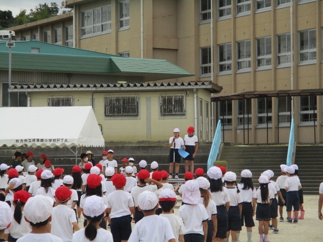 天候が心配されましたが、予定通り運動会の全体練習を行うことができました。今回は開会式の練習が中心です。6年生は、先日の係活動での練習の成果をしっかりと発揮し、スムーズな運営をしてくれました。練習を重ねる中で、行進や礼の仕方なども、どんどん上達しています。練習後には、グラウンドの石拾いを行いました。全校児童が協力して、たくさんの石を拾ってくれました。安全に運動会ができるよう、みんなで力を合わせて準備を進めています。