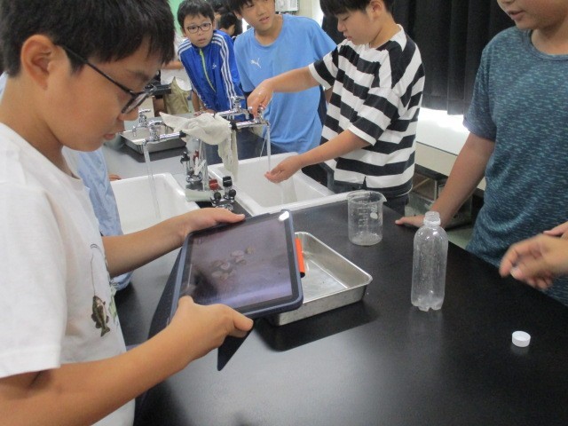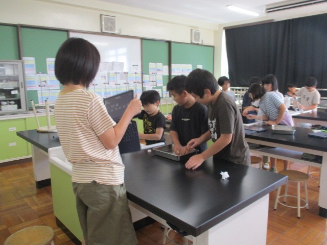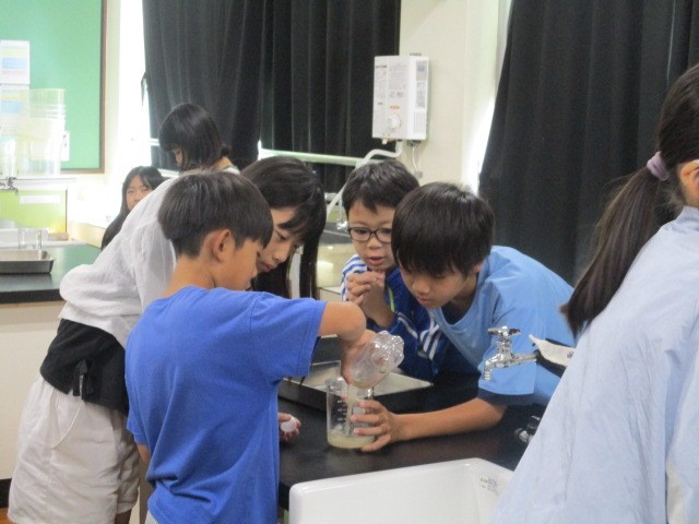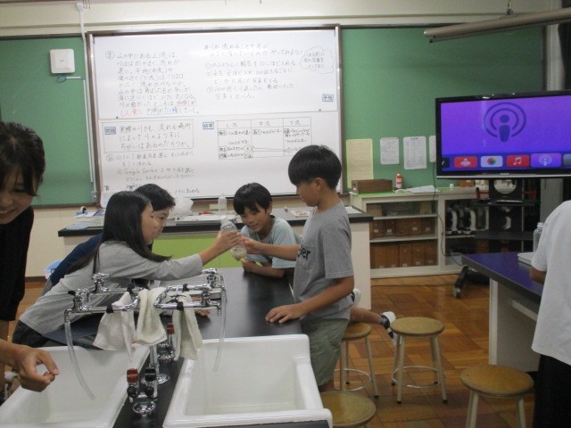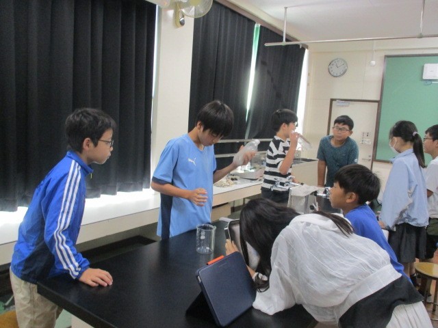 5年生は理科の授業で「流れる水のはたらき」について学んでいます。この日は、「川の流れによって石が小さくなるのか」を確かめるために、ペットボトルに軽石を入れ、100回ずつ振って石の変化を調べました。子どもたちはペットボトルを力いっぱい振り、石の大きさの変化を写真に撮って比べながら、楽しそうに観察していました。石の変化を興味深そうに観察する子どもたちの姿が、とても印象的でした。