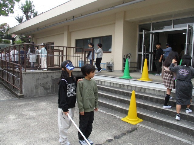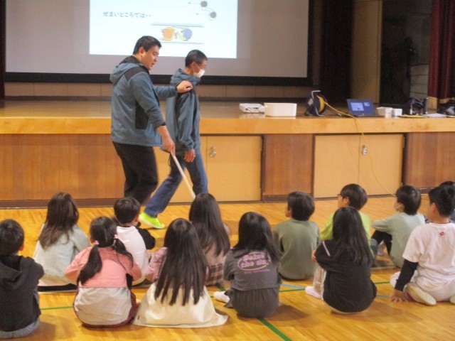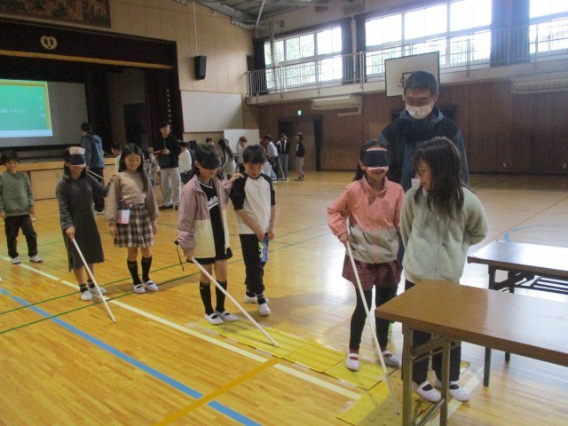 4年生は、アイマスクと白杖(はくじょう)体験の出前授業を受けました。白杖を使っているのはどのような方なのか、また、どんなことに気をつけて接するとよいのかについて説明を受けたあと、実際にペアになってアイマスクをつけ、白杖を使って歩く体験をしました。子どもたちは、ペアの友達に優しく声をかけながら、安心して歩けるように丁寧にサポートしていました。この体験を通して、日常生活の中でも白杖を使う方への思いやりや配慮の気持ちが育っていってくれたら嬉しいです。