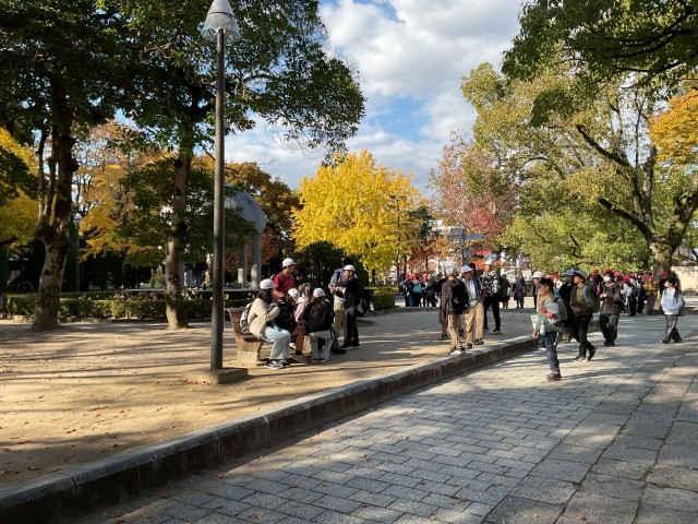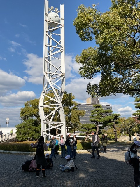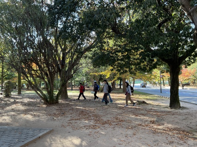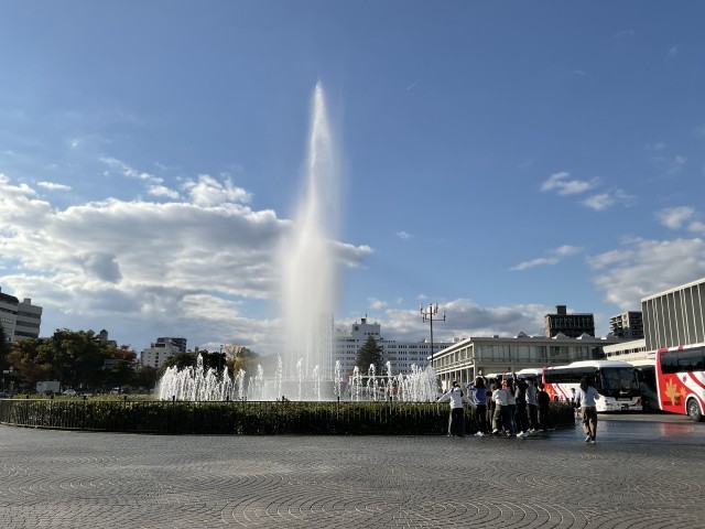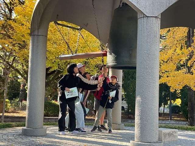 平和記念公園では学習班に分かれて、碑めぐりを行いました。修学旅行のしおりに記載された平和の時計塔や平和の鐘など、7箇所のチェックポイントを巡り、見た様子や感じたこと、分かったことをメモしながら回りました。お天気に恵まれ、紅葉も美しく、静かな公園の中で平和に着いて考える時間となりました。