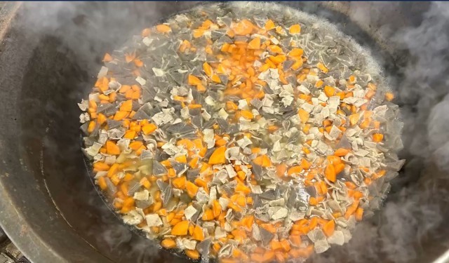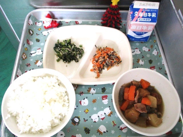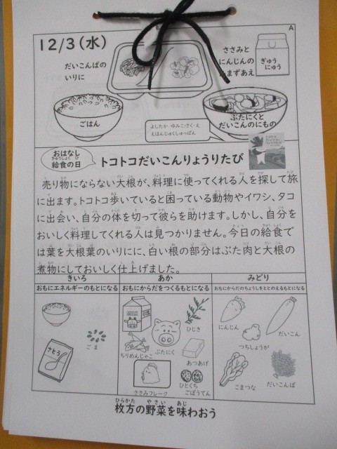 12月のおはなし給食のメニューは「豚肉と大根の煮物」でした。給食をいただきながら、給食委員さんが絵本『トコトコだいこん りょうりたび』を読み聞かせしてくれたり、調理の様子を動画で見たりしました。今回は大根の葉も「大根葉のいり煮」として提供され、大根をまるごと味わうことができました。寒さが厳しくなる季節に、心も体もぽかぽかと温まる給食となりました。