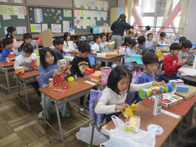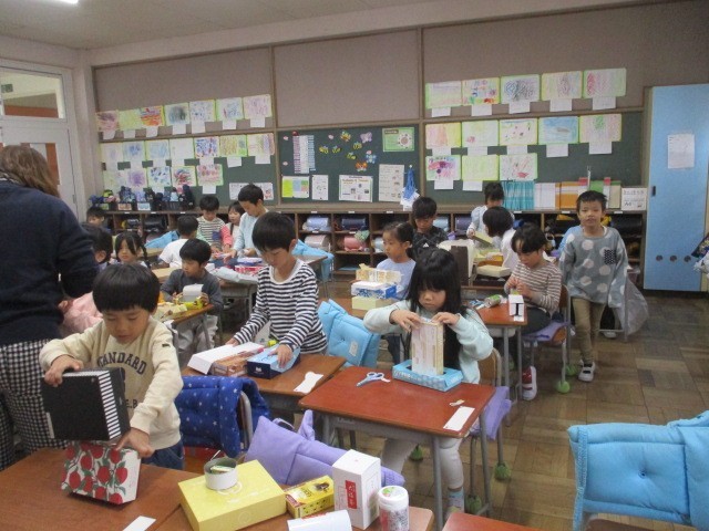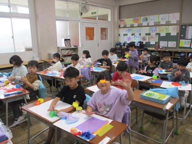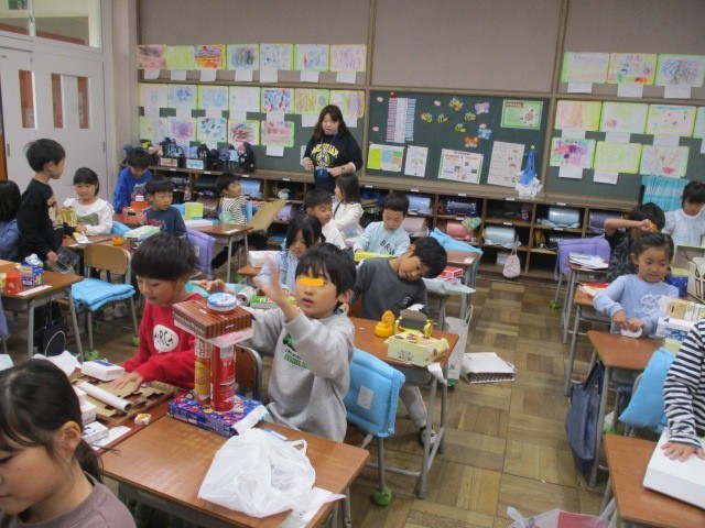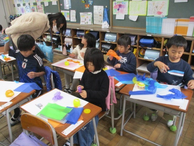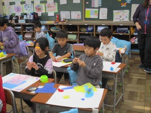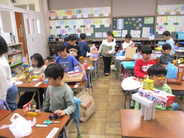 1年生の図工「はこと はこを くみあわせて」と「ふわっと ぎゅっと おはながみの え」の授業の様子です。子どもたちは、お花紙の形や組み合わせを工夫しながら、のりで貼って表したいものを考えています。また、箱の組み合わせや付け方を工夫して、自分の作りたいものを形にしていきます。材料の形や色を楽しみ、組み合わせて作品をつくることに夢中になっている子どもたちの姿が見られました。