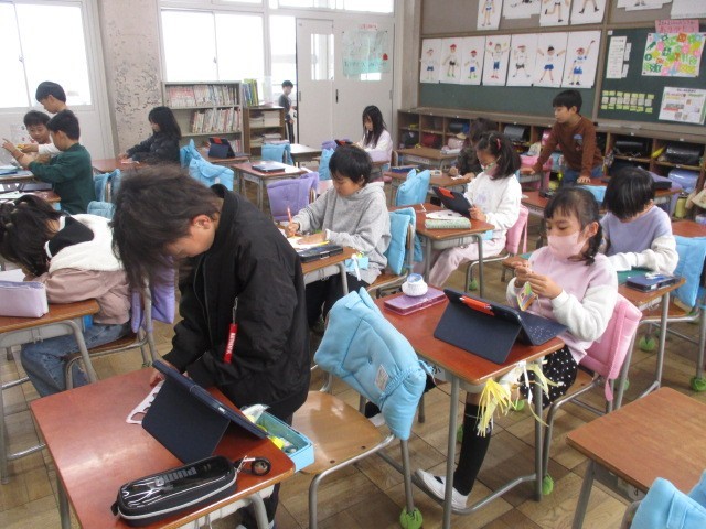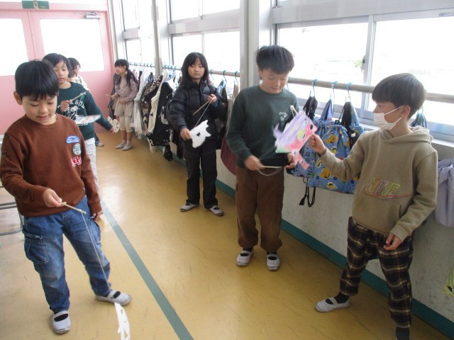 2年生は図工で「ジャンプ!キャッチ!紙けん玉!」に取り組みました。色や形を工夫して、厚紙を使ってけん玉を作りました。完成した紙けん玉で遊ぶ中で、紙の裏に書いた得点で高得点が出ると、さらに嬉しそうにしながら、子どもたちは楽しそうに遊んでいました。