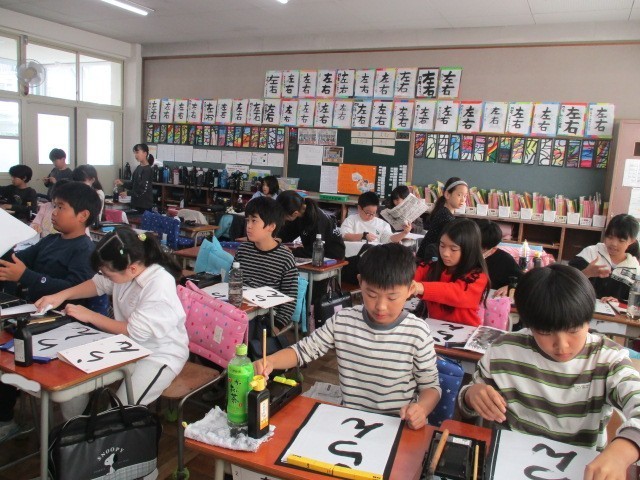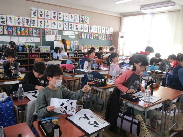 4年生の書道の授業の様子です。子どもたちはお手本を見ながら真剣に筆を運び、納得のいく作品が書けるまで何度も挑戦していました。教室には静かな集中の空気と、作品が完成したときの喜びに満ちた雰囲気が漂っていました。