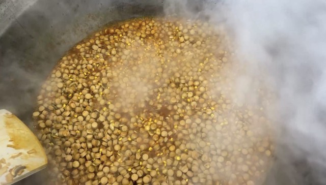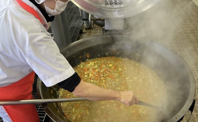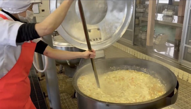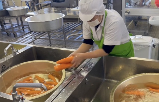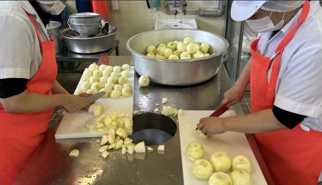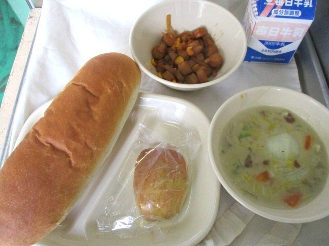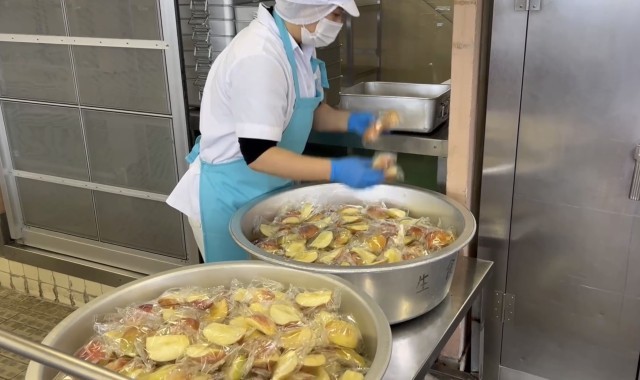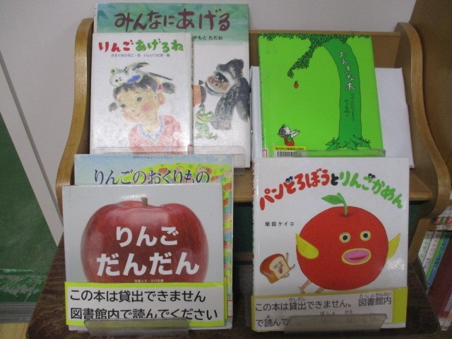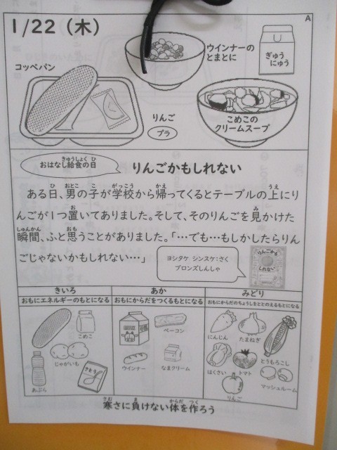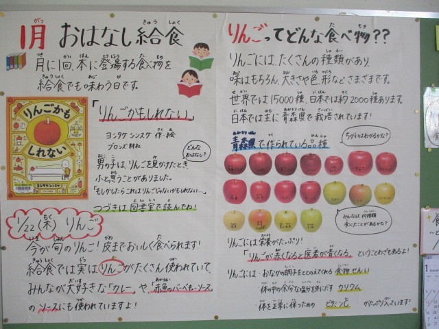 今月のおはなし給食のテーマは、絵本『りんごかもしれない』に登場する「りんご」でした。メニューは「米粉のクリームスープ・ウインナーのトマト煮・りんご・コッペパン・牛乳」です。給食の時間には、給食委員の4年生が絵本を読んでくれる動画が教室で流れ、子どもたちは楽しそうに耳を傾けていました。また、毎回調理場の様子も栄養士さんが撮影して紹介してくださいます。エアコンのない寒い環境の中でも、調理員の皆さんは毎日心を込めておいしい給食を作ってくださっています。子どもたちが少しでも食べやすいようにと、さまざまな工夫もされています。今回は、ウインナーのトマト煮をパンに挟んで食べやすいよう、水分をできるだけ飛ばすために長めに煮込んでくださいました。調理員の皆さん、いつもおいしい給食をありがとうございます。図書室には、司書さんが子どもたちのためにそろえてくださった、りんごにまつわる絵本が並んでいます。