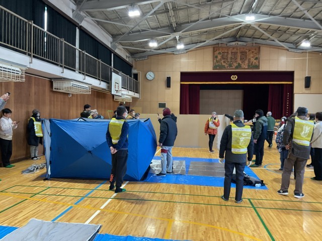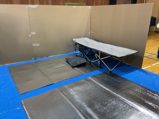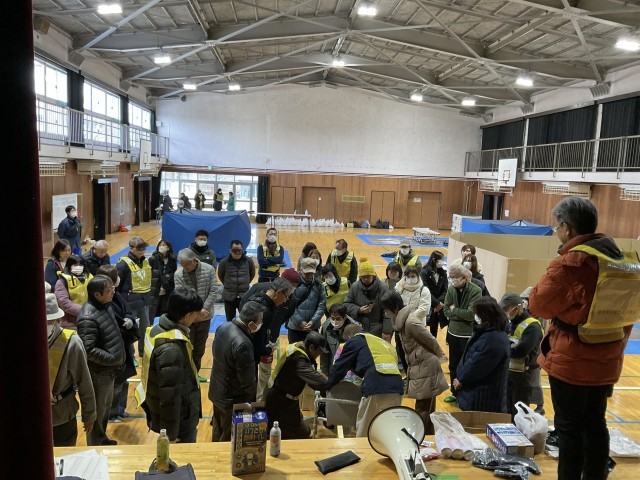 樟葉南校区コミュニティでは、自治会員の防災意識を高めるとともに、南小に備蓄されている防災用品の保管場所や使用方法を広く共有することを目的に、校区防災訓練を実施しました。当日は、防災委員の方々が避難所受け入れの準備を行い、避難して来られた地域の皆さんと一緒に、体育館での居住スペースづくりに取り組みました。間仕切りダンボールや簡易ベッドの組み立て、非常用トイレでの凝固剤の使用体験、発電機の稼働確認など、実際に避難所を開設した状況を想定した実践的な訓練となりました。いざという時に備えて、日頃から準備しておくことの大切さを改めて感じる機会となりました。