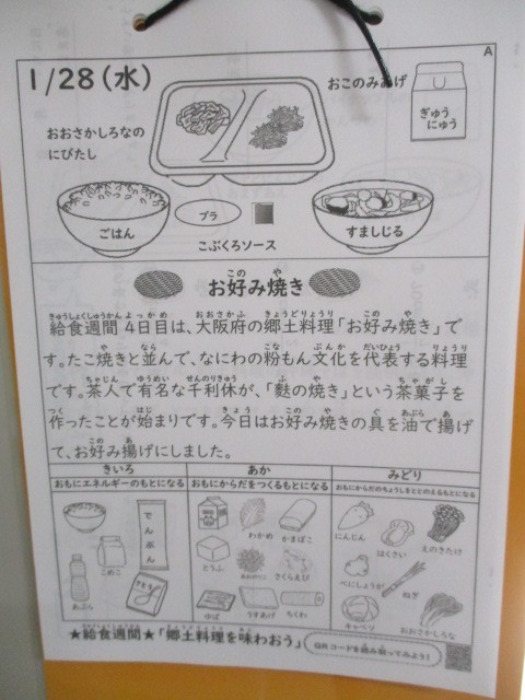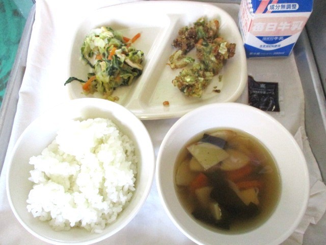 枚方市学校給食週間の4日めは、大阪の郷土料理「お好み揚げ」でした。その他のメニューは「大阪白菜の煮びたし・すまし汁・ごはん・牛乳」と、地域の味を楽しめる内容でした。なにわの粉もん料理を代表する「お好み焼き」を揚げた「お好み揚げ」は、子どもたちにも大人気のメニューです。一口サイズで食べやすく、サクサクとした食感が楽しめ、とても美味しくいただきました。