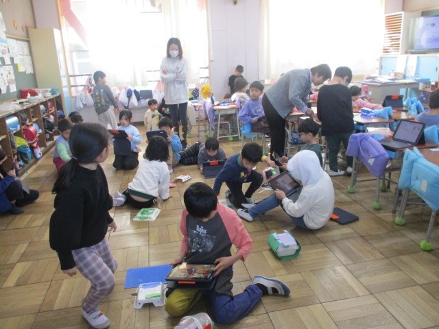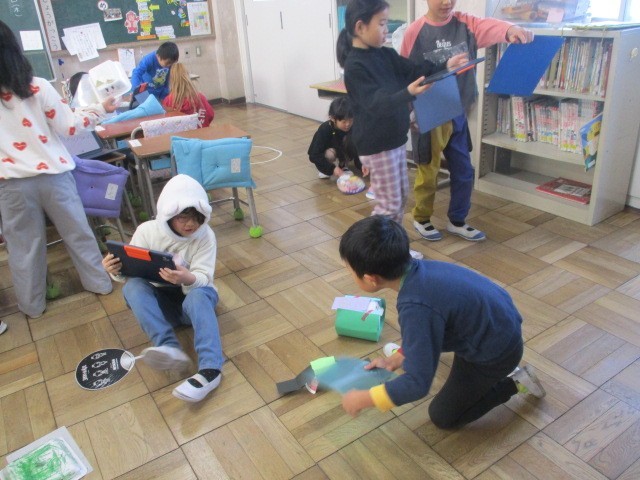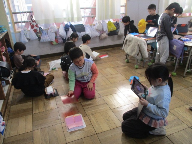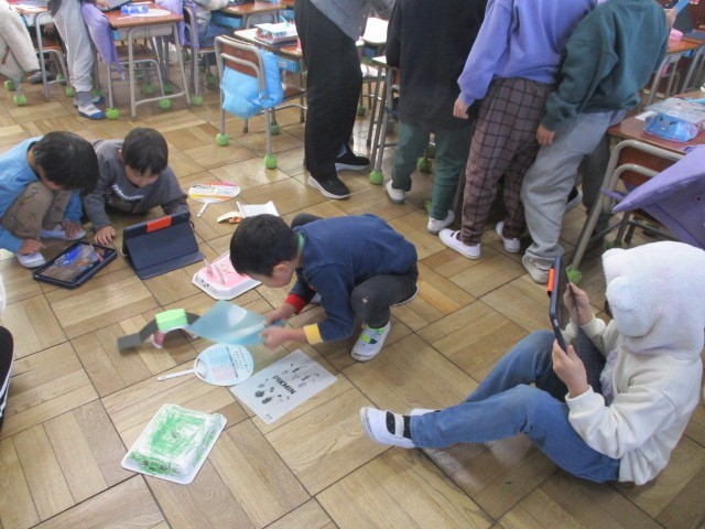 1年生の図工の時間、子どもたちはスチレン容器を切って形を作り、パタパタと風を送って動かす「ふわふわゴー」に取り組みました。切り方や飾りの工夫によって動きが変わるのがおもしろく、どんな風にあおぐとよく動くのか試しながら楽しんでいました。