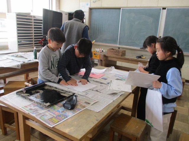 3年生の図工の様子です。「スチレンはん画」に取り組み、かたおしヘラを使って模様や好きな形を丁寧に描いていました。自分で選んだ色をローラーでのせ、思い思いの版画ができあがりました。