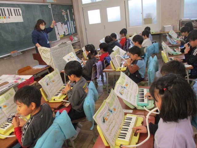1年生の音楽の時間の様子です。鍵盤ハーモニカの演奏もずいぶん上手になってきました。