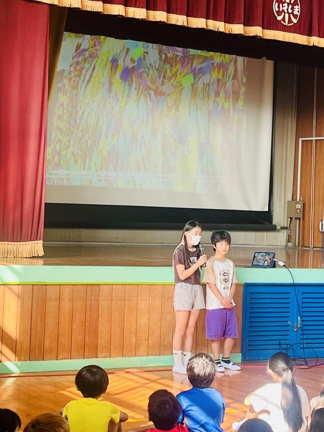 体育委員からは体力向上を目的としてドッジボールやサッカーをやりますよという呼びかけがあり、低学年を中心に大歓声が上がりました。素晴らしい企画なので、ぜひ積極的に参加しましょうね。最後は6年生の代表から平和学習の取組への協力依頼がありました。これから全学年で千羽鶴を作成し、6年生が代表して広島へ届けます。6年生の先輩たちが折り方を教えに来てくれるので、平和への願いを込めて折りましょう。今日の児童集会も主役は120%子どもたちでした。磯島小学校は今、大きく成長しています。