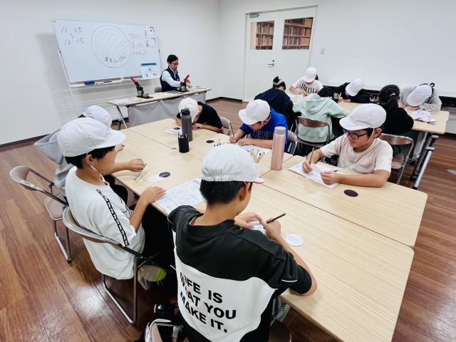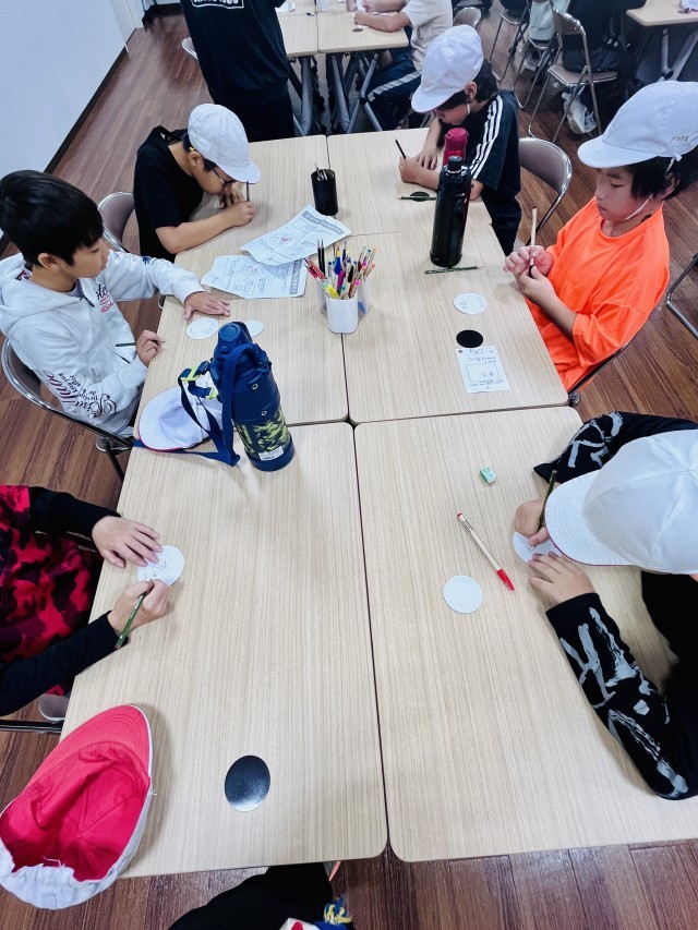 後半クラスの缶バッジ制作の様子。漢字を選んだ理由もそれぞれです。今日持ち帰りますので、どんな思いが詰まっているか聞いてあげてください。