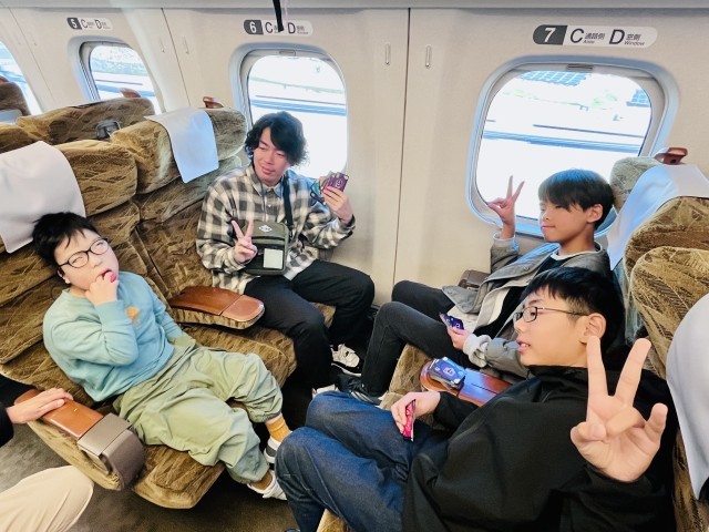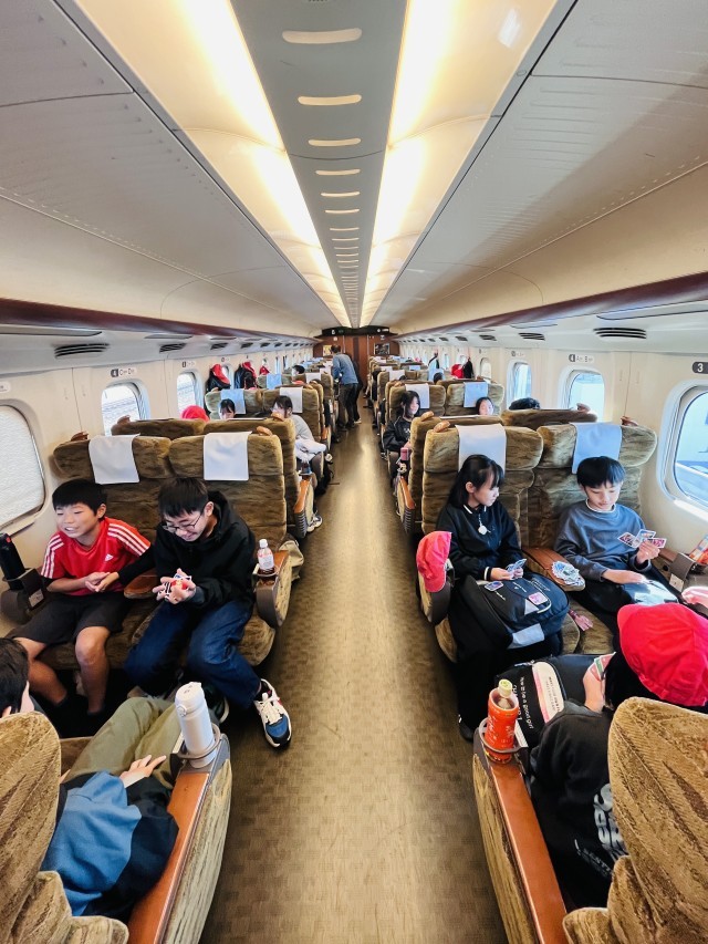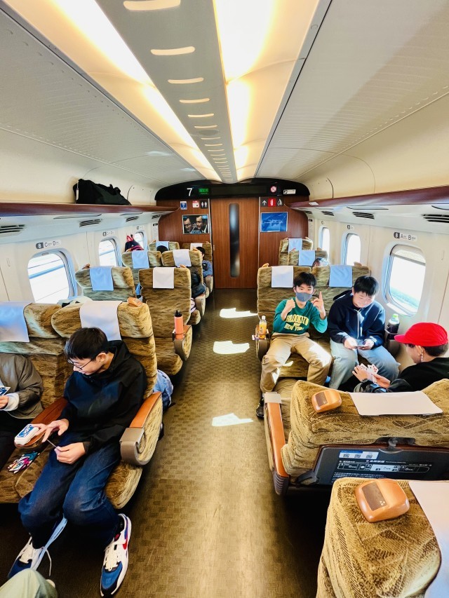 車内レクのひとコマ。修学旅行専用列車なので車内はゆったりしています。現在岡山駅を通過中です。