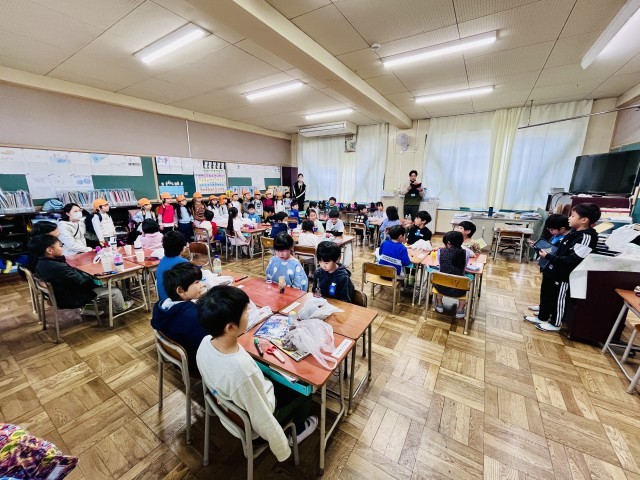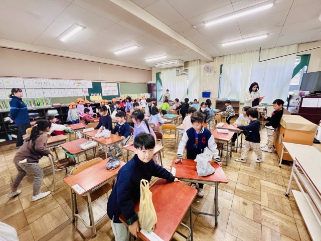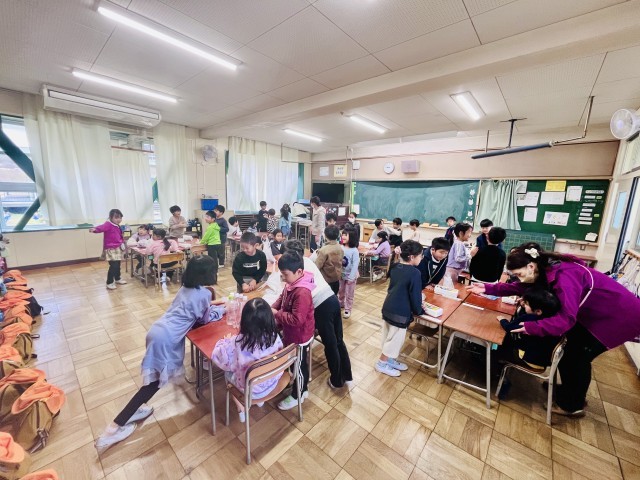 今日は1年生が天の川保育園の年長さんと交流学習に取り組みました。先日、御殿山神社で拾ってきたどんぐりなどを使って、一緒に秋のおもちゃを作ったり、遊んだりして時間いっぱい楽しみました。