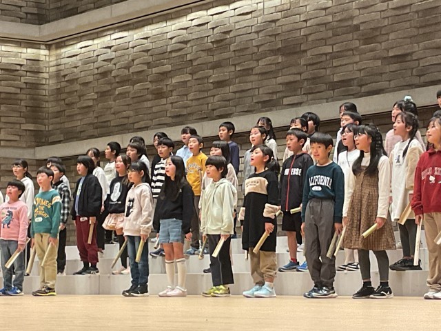 磯島小学校はトップバッターで一層緊張したと思いますが、大きなホールにきれいな歌声と息の合った竹の音色が響き渡りました。大きな拍手を浴びて舞台から降りてきたみんなの表情からはホッとした安心感とやり切ったという充実感が伝わってきました。みんなのメッセージ、コトバはちゃんとオーディエンスに届いていましたよ!