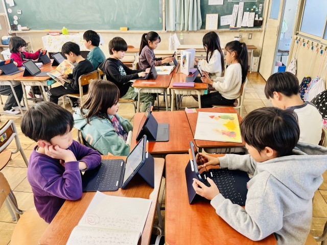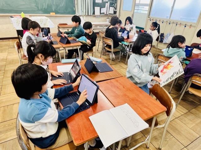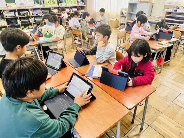 2年生の国語科では読んだ本の内容を簡潔にまとめ、友達にその内容を伝える活動に取り組んでいました。どんな情報が必要で、どんな情報を省けるのか、「まとめる」という活動は中学校の授業でもよく取り入れられている効果的な学習方法です。