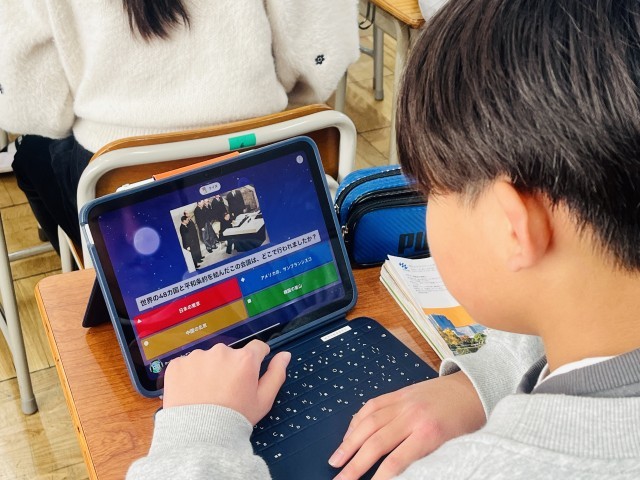 3時間目に6年1組をのぞくと2組の担任がKahoot!というアプリを使って授業をしていました。あまりに自然な雰囲気だったので、最初は担任の先生が入れ替わっていることに気づかなかったほどです。磯島小学校では子どもたちがより多くの先生と接し、困ったことがあれば気軽に話せる先生を増やしていくことを目的に令和6年度より全学年で授業交換制を実施しています。