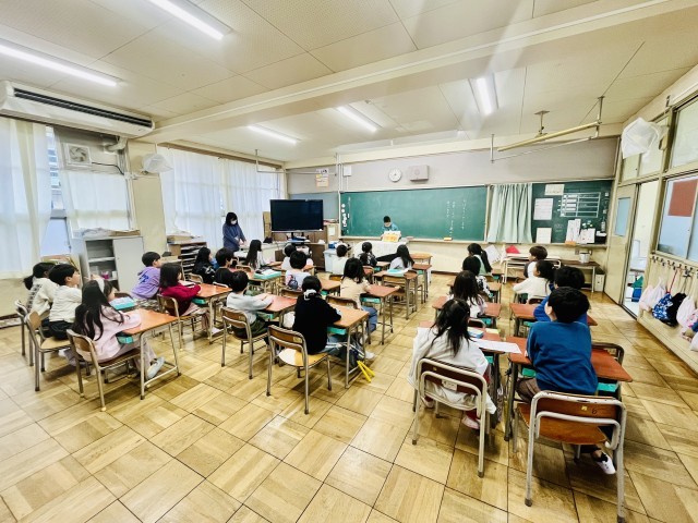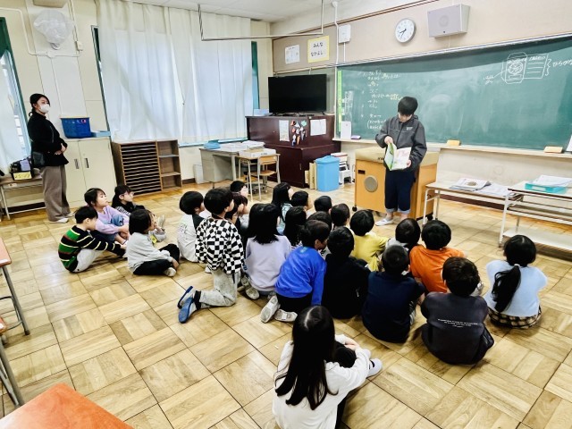 図書委員のお兄さん、お姉さんが読み聞かせにやって来てくれました。ただし、読んでくれるのは途中まで。「続きは図書室に来て読んでね!」という読書活動推進の取組でした。様々な工夫があっておもしろいですね!