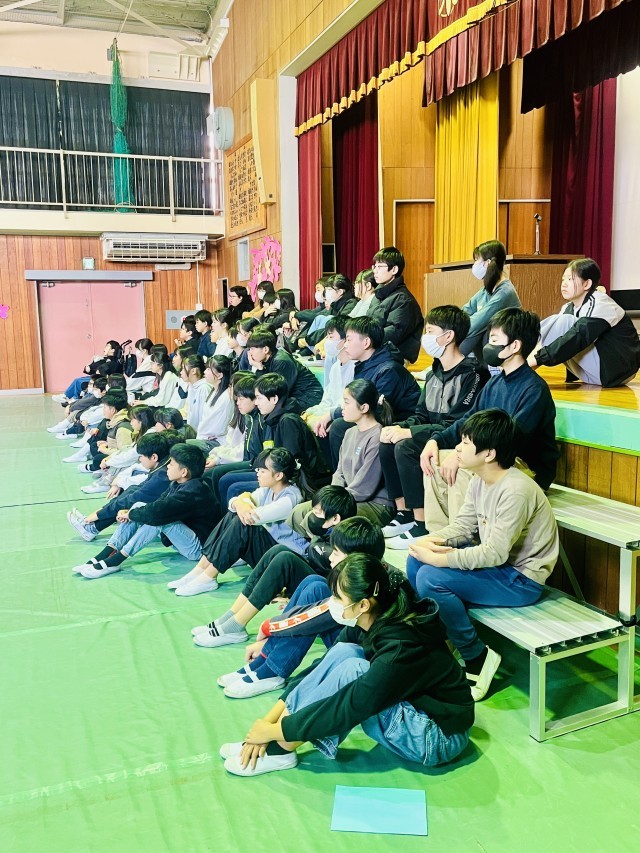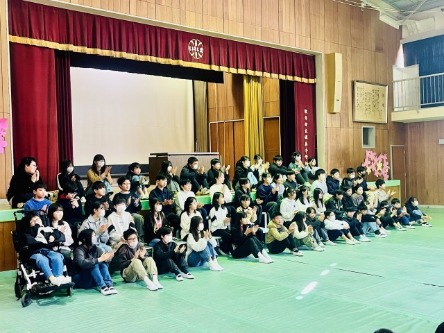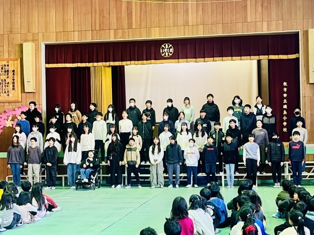 6年生からはお礼の言葉と、卒業式で歌う歌が贈られました。卒業式には5年生しか出席できないので、みんなにひと足さきに聞かせてくれたのですね。ありがとう、6年生。