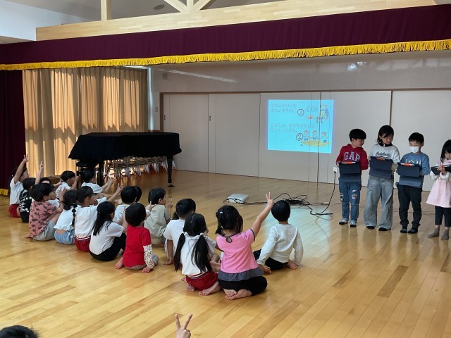 休み時間の過ごし方についてクイズを出しながら、「友だちと仲よくしましょう。」「いじめをしてはいけません。」「一緒に遊ぶ時にはズルをしてはいけません。」を伝えていました。