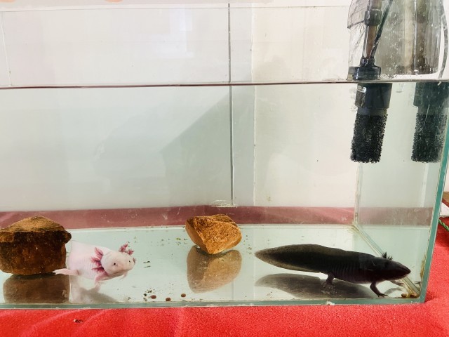 そしてクリーン大作戦の恩恵はウーパールーパーにも。一旦、水槽の水を全部抜いて底面までピカピカに磨いてくれました。あまりにも清潔になったため、ウーパールーパーたちも底面に映る自分の姿に少し戸惑っているようです。6年生の本気のプロジェクトはすごいですね!