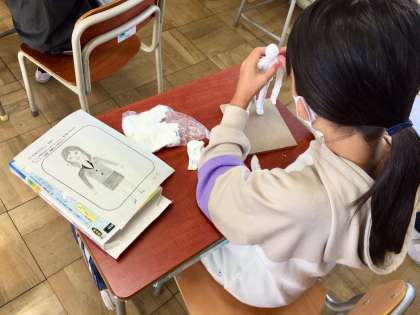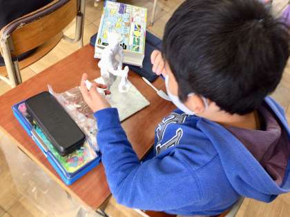 6年生が粘土細工をしていました。「12年後のわたし」という素敵なテーマです。いろいろなポーズで小道具、背景をも加え、作っていました。写真は、弁護士さんとラーメン屋さんをイメージして作っているところです。