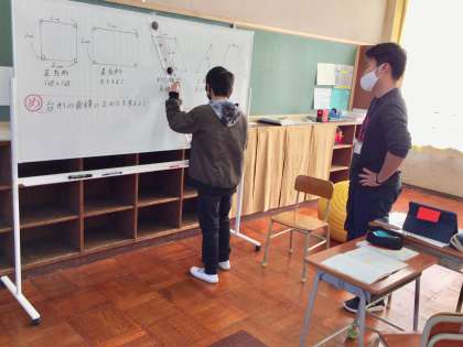 あおば学級の算数「四角形と三角形の面積」で、台形の面積を求め方を考える授業でした。