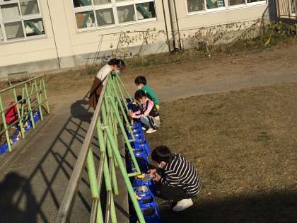1年生はチュリーップの水やりを2日に1回程度行っています。友だち同士で「水が少ない」「かけすぎ」などと言いながら、水やりをしています。微笑ましい光景です。