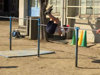 「がんばれ、がんばれ」「やったぁ」「おっしいー」などの声が聞こえてくるので、グランドに行ってみると5年生が、鉄棒のテストをしていました。友だちを励ます純粋な応援がとても気持ちよかったです。