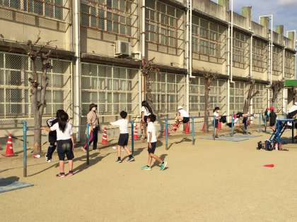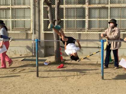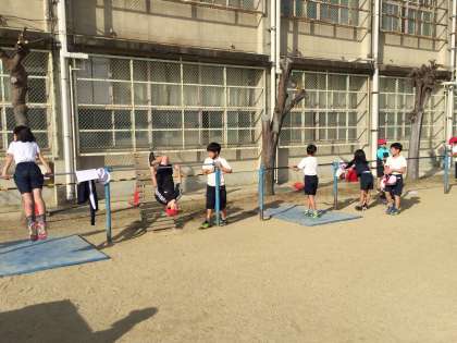 昨日の、4年生体育の授業です。一つのクラスは、鉄棒を、別のクラスは高跳びの練習をしていました。どちらのクラスもそれぞれの目標を達成するために一生懸命練習を繰り返していました。