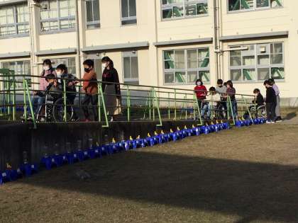4年生2クラスで、総合的な学習の時間で車いす体験学習を行いました。まず、ビデオで車いすについて学習し、実際に校舎やグランドで車いす体験をしました。車いすに乗っている子は、後ろ向きの時には怖かったと言っていました。また、普段気づかない、車いすが通りにくい箇所などに気づいた子などもいました。