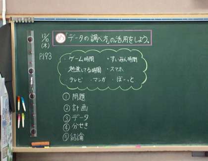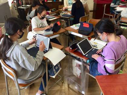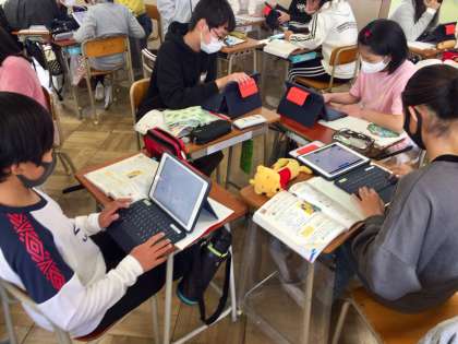 6年生算数の授業、データの調べ方の学習で 1.アンケートを作成し、2.それを友だちに回答してもらい、3.分析するという学習をしていました。ロイロノートを使い、1.2.のことを難なくしていました。驚きました。