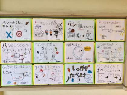 校内には児童や先生が作った素敵な掲示物がいっぱいです。給食委員会、美化委員会、保健室、2年生のクラスの掲示物を紹介します。