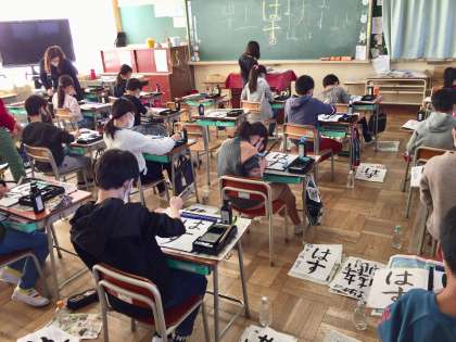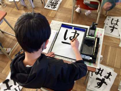 4年生が書写の時間に習字をしていました。とめ、はねなどに注意して手本を見て、慎重に書いていました。墨のいい匂いがなんとも言えませんでした。