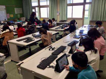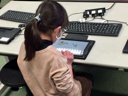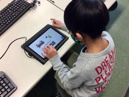 2年生は生活科の授業でタブレットに慣れる学習をしていました。現在練習している九九を、ソフトを使って勉強していました。子どもたちが進んで学習しているところが、とてもいいです。また、靴を美しく揃えているのももっといいです。
