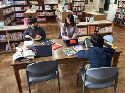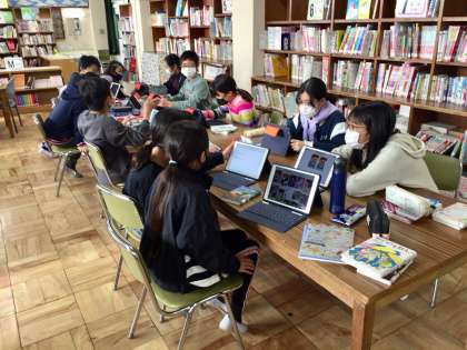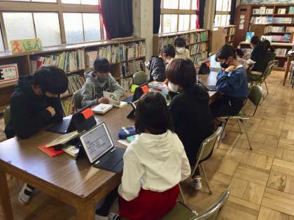 6年生が国語の授業で、本のすいせんカード作りをしていました。図書室で本を選び、iPadで工夫して作成していました。