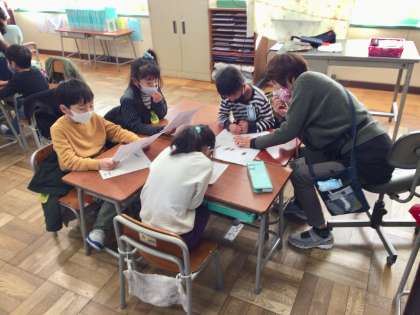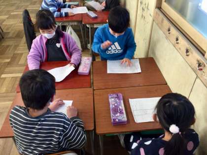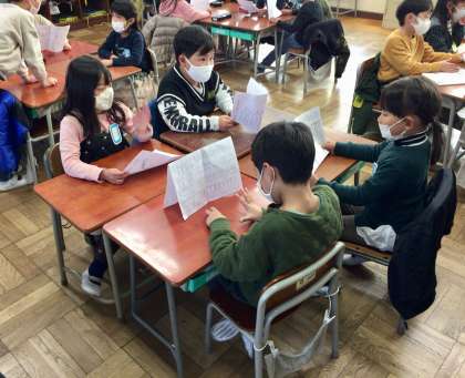 1年生が国語で、谷川俊太郎さんの「とっきっき」を学習し、群読の練習と発表をしていました。別室で先生が発表の様子をビデオ撮影し、後日、みんなで観るとのことです。どのグループもよいチームワークで、上手に読めていました。