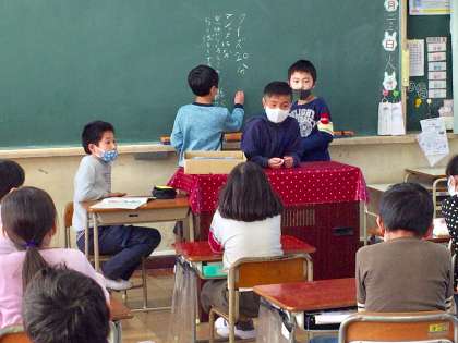 4年生が学級活動の時間に、お楽しみ会の話し合いをしていました。することや時間などを司会の子たちが中心になって、話を進めていました。