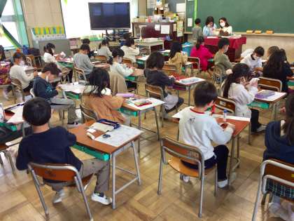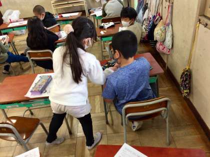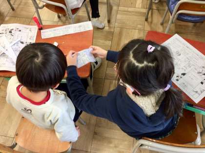 2年生が図画工作の授業で「絵合わせパズル」を作っていました。準備されたプリントから、パズルをハサミで切り取ることはできるのですが、パズルができず、教え合いながら楽しんでいました。